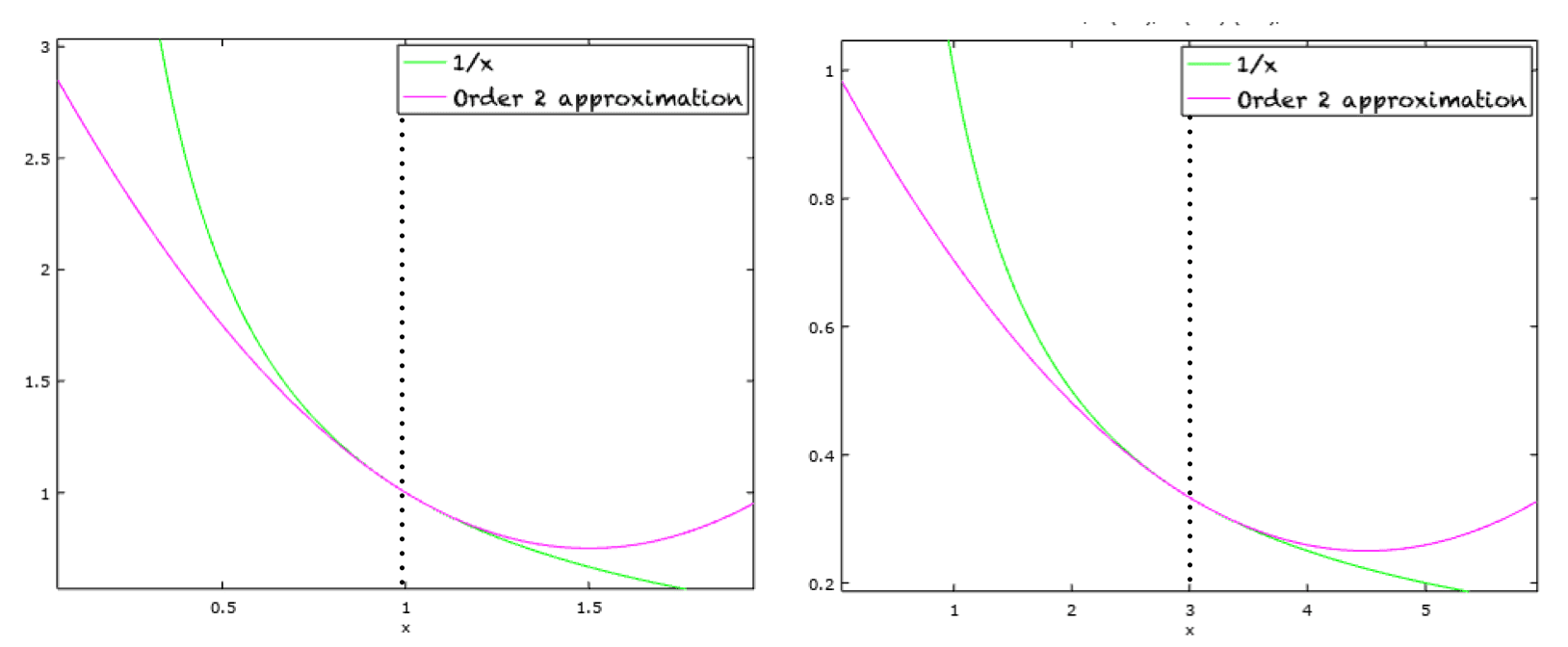 在下面的图中,函数 1/x 绘制在 x=1 点附近(左)和 x=3 点附近(右)。绿色线是实际函数 f(x)= 1/x。粉色线表示通过 2 阶多项式进行的近似。