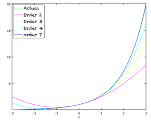 下面的图显示了估计 e^x 在 x=0 附近值的不同阶多项式。我们可以看到,当我们远离零点时,我们需要更多的项来更准确地近似 e^x。代表实际函数的绿色线隐藏在阶数为 7 的近似多项式的蓝色线后面。