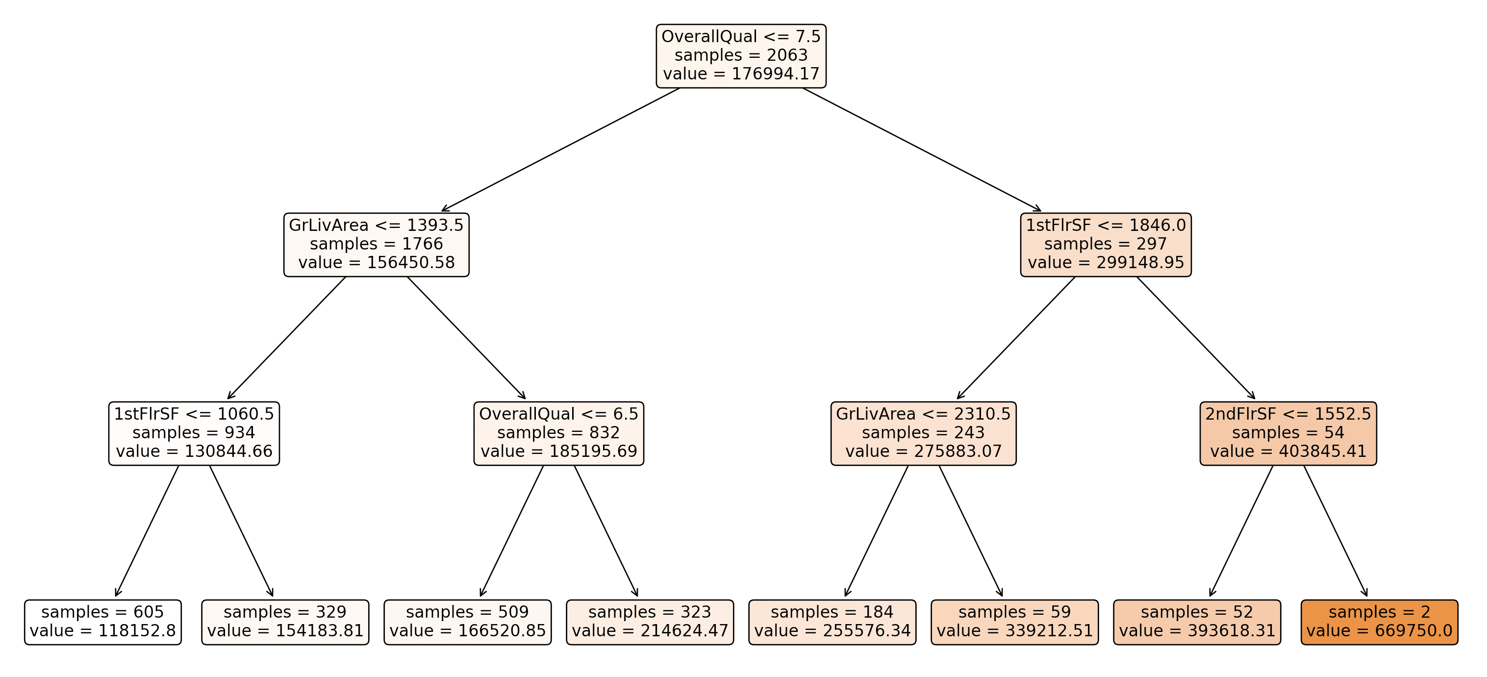 # 导入必要的库 import pandas as pd from sklearn import tree import matplotlib.pyplot as plt 来自 sklearn.tree 导入 DecisionTreeRegressor from sklearn.model_selection import train_test_split # 加载所有没有缺失值的数值特征 Ames = pd.read_csv('Ames.csv').select_dtypes(include=['int64', 'float64']) Ames.dropna(axis=1, inplace=True) X = Ames.drop('SalePrice', axis=1) y = Ames['SalePrice'] # 划分数据 X_train, X_test, y_train, y_test = train_test_split(X, y, test_size=0.2, random_state=42) # 初始化并拟合决策树 tree_model = DecisionTreeRegressor(max_depth=3) tree_model.fit(X_train, y_train) # 使用sklearn可视化决策树 plt.figure(figsize=(20, 10)) tree.plot_tree(tree_model, feature_names=X.columns, filled=True, impurity=False, rounded=True, precision=2, fontsize=12) plt.show() |