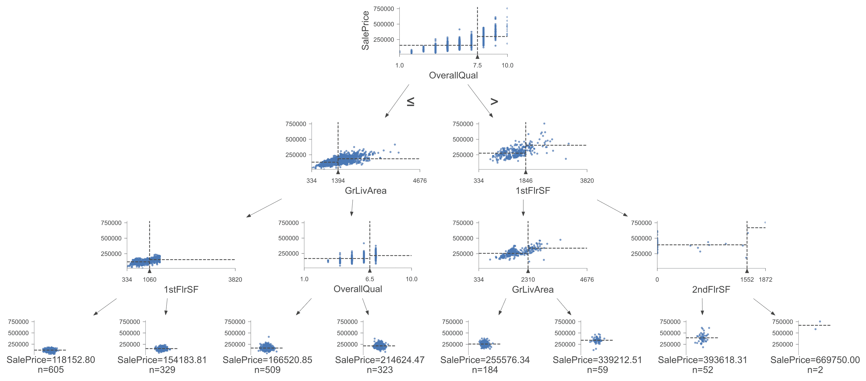 此树中选择用于分割的特征包括“OverallQual”、“GrLivArea”、“1stFlrSF”和“2ndFlrSF”。这些特征是根据它们在分割数据时减少MSE的能力来选择的。这些分割的级别或阈值(例如,OverallQual <= 7.5)在训练过程中确定,以优化数据点分离为更同质的组。 - 解释分割和箭头