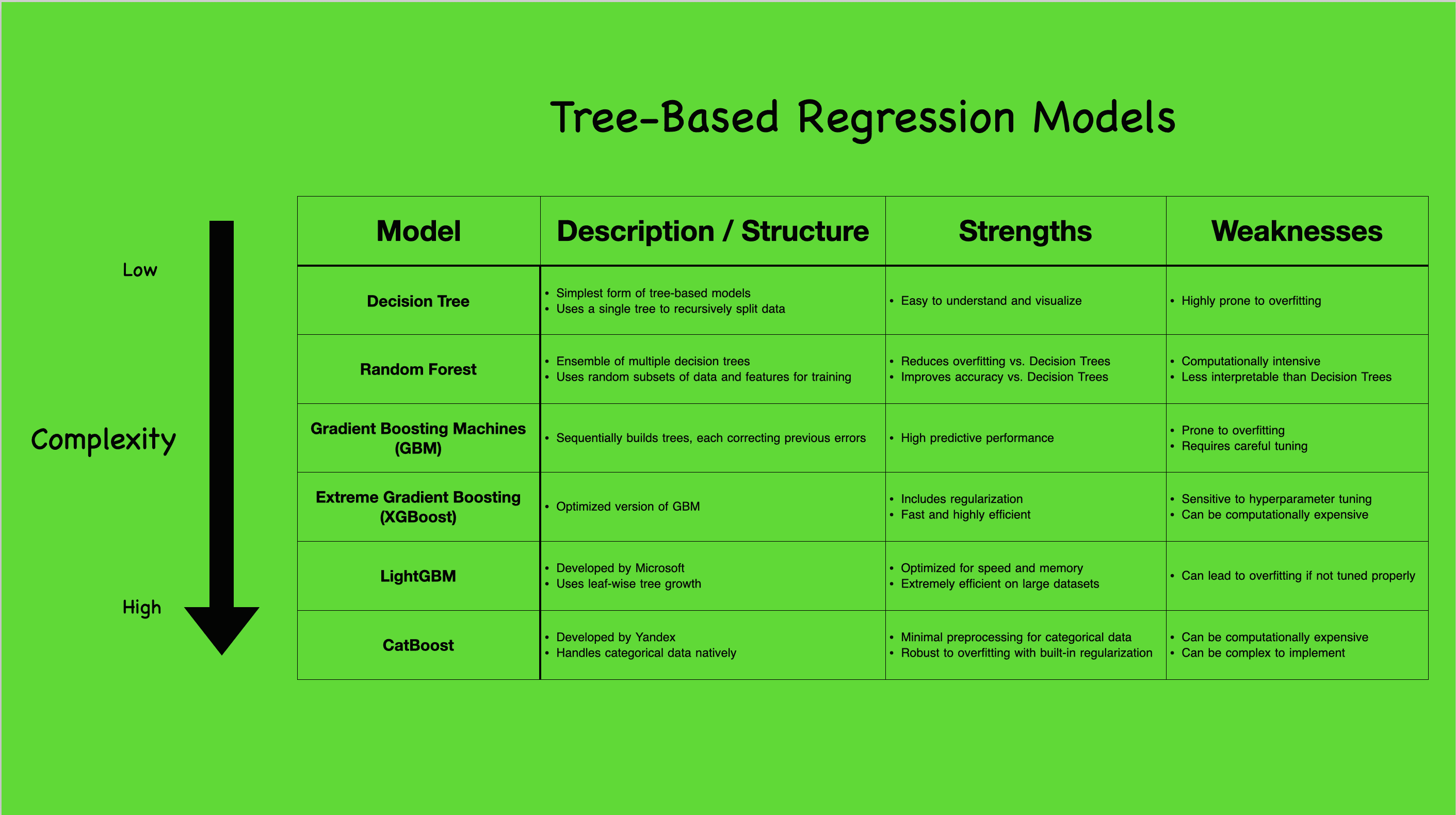 基于树的模型有各种复杂性,每个模型都有独特的功能,适用于不同的场景。为了更好地理解基于树的回归模型的范围,让我们看看下面的可视化图,它总结了一些流行的模型