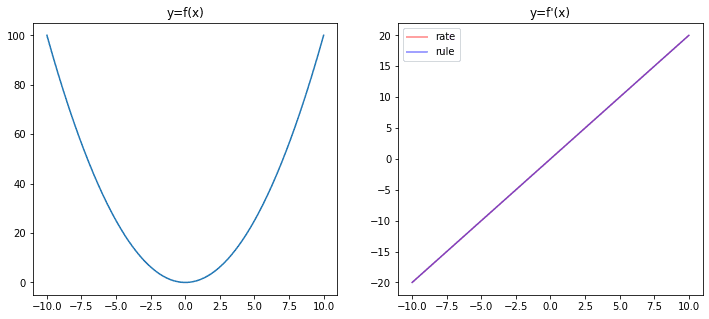 import numpy as np import matplotlib.pyplot as plt # 定义函数 f(x) def f(x): return x**2 # 计算 f(x) = x^2,x 从 -10 到 10 x = np.linspace(-10,10,500) y = f(x) # 在图形的左半部分绘制 f(x) fig = plt.figure(figsize=(12,5)) ax = fig.add_subplot(121) ax.plot(x, y) ax.set_title("y=f(x)") # 使用变化率计算 f'(x) delta_x = 0.0001 y1 = (f(x+delta_x) - f(x))/delta_x # 使用公式计算 f'(x) y2 = 2 * x # 在图形的右半部分绘制 f'(x) ax = fig.add_subplot(122) ax.plot(x, y1, c="r", alpha=0.5, label="变化率") ax.plot(x, y2, c="b", alpha=0.5, label="公式") ax.set_title("y=f'(x)") ax.legend() plt.show() |