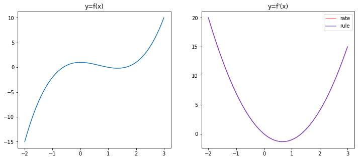 在上图中,我们可以看到通过变化率计算出的导数函数和通过求导法则计算出的导数函数完美地吻合。