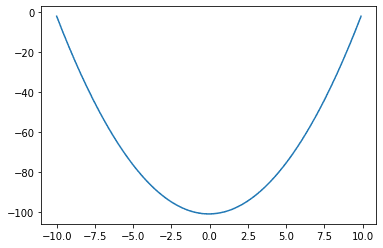 import numpy as np import matplotlib.pyplot as plt def f(x): return 2*x # 设置 x 从 -10 到 10,步长很小 delta_x = 0.1 x = np.arange(-10, 10, delta_x) # 计算 f(x) * delta_x fx = f(x) * delta_x # 计算累加和 y = fx.cumsum() # 绘制 plt.plot(x, y) plt.show() |