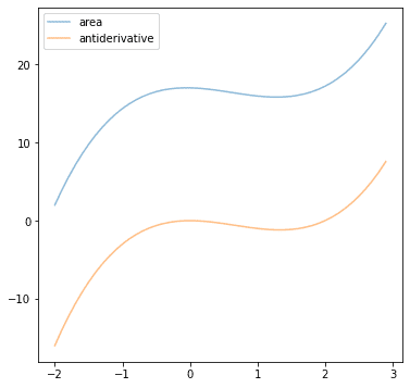 plt.plot(x, y, c=”r”, alpha=0.5, label=”antiderivative”)