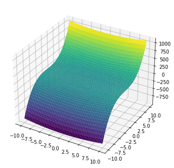 import numpy as np import matplotlib.pyplot as plt # 定义 x 和 y 的范围 x = np.linspace(-10,10,1000) xv, yv = np.meshgrid(x, x, indexing='ij') # 计算 f(x,y) = x^2 + y^3 zv = xv**2 + yv**3 # 绘制曲面 fig = plt.figure(figsize=(6,6)) ax = fig.add_subplot(projection='3d') ax.plot_surface(xv, yv, zv, cmap="viridis") plt.show() |