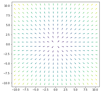 import numpy as np import matplotlib.pyplot as plt # 定义 x 和 y 的范围 x = np.linspace(-10,10,20) xv, yv = np.meshgrid(x, x, indexing='ij') # 计算 f(x,y) 的梯度 fx = 2*xv fy = 2*yv # 将向量 (fx,fy) 转换为大小和方向 size = np.sqrt(fx**2 + fy**2) dir_x = fx/size dir_y = fy/size # 绘制曲面 plt.figure(figsize=(6,6)) plt.quiver(xv, yv, dir_x, dir_y, size, cmap="viridis") plt.show() |