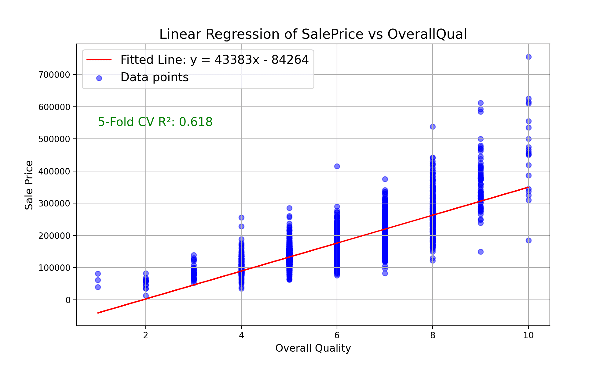 通过基本的线性回归,我们的模型得出了以下方程:y = 43383x - 84264。这意味着质量每增加一个点,销售价格大约增加 43,383 美元。为了评估我们模型的性能,我们使用了 5 折交叉验证,得到的 R² 值为 0.618。这个值表明,使用这个简单模型,大约 61.8% 的销售价格变异性可以由房屋的整体质量来解释。