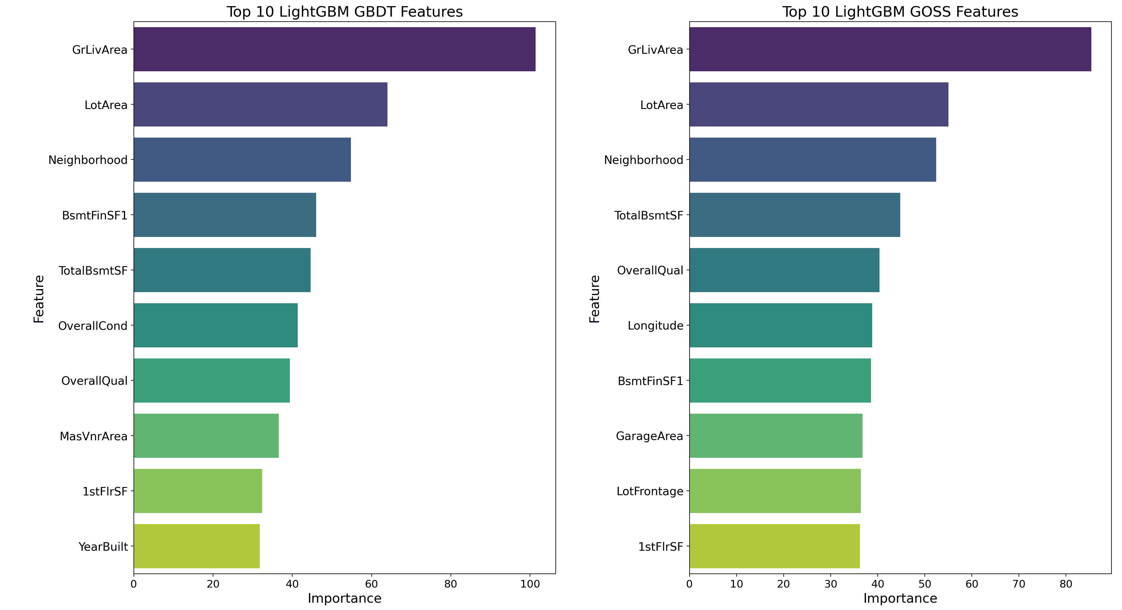 分析揭示了每个模型在特征优先排序方面有趣的模式。GBDT 和 GOSS 模型都强烈偏向“GrLivArea”和“LotArea”,突显了物业大小在确定房价中的基本作用。此外,两个模型都高度评价了“Neighborhood”,强调了地点在住房市场中的重要性。