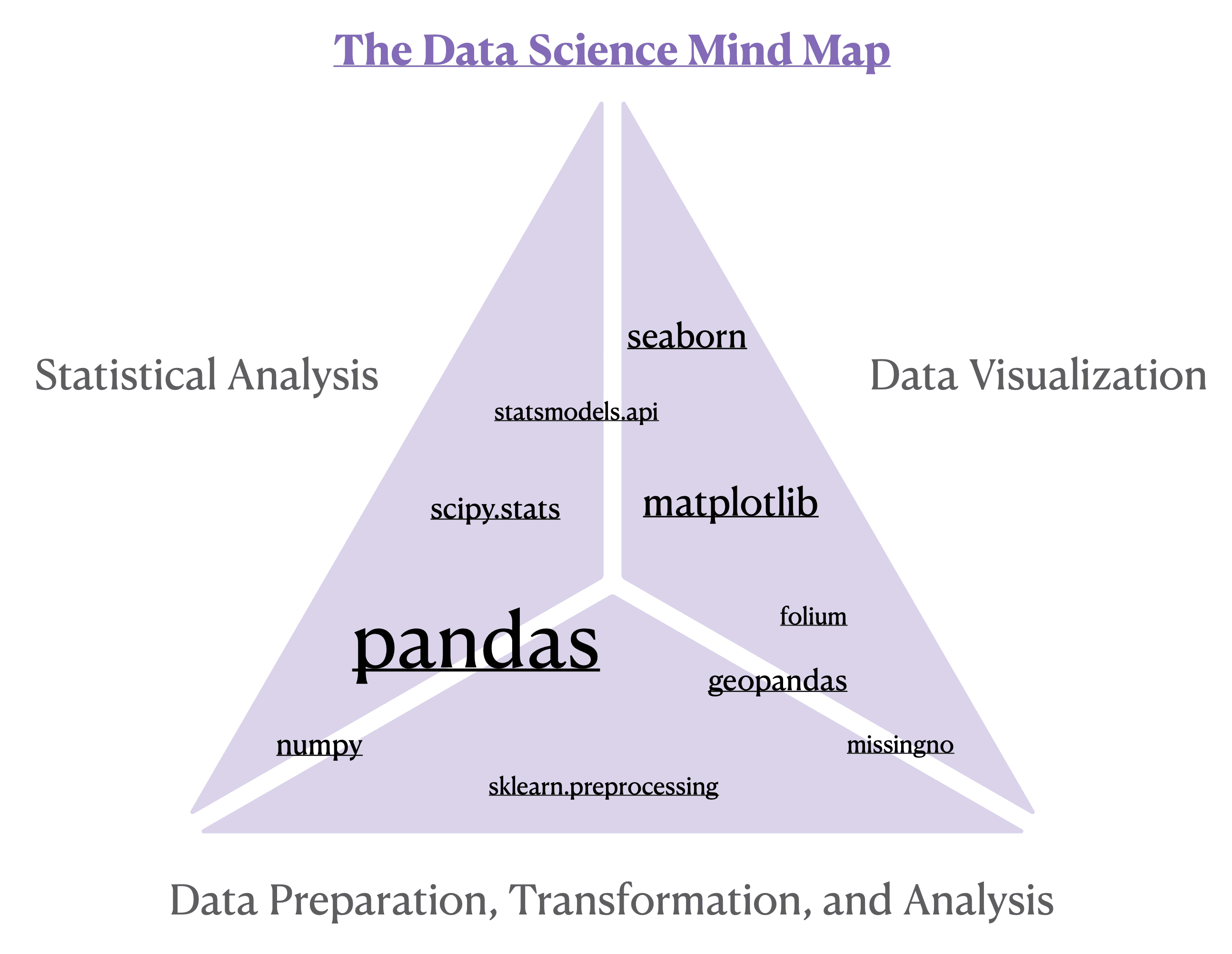 在我们掌握数据科学思维导图的过程中,我们强调了每个数据科学家都应熟悉的Python基础包的重要性。这些包构成了我们思维导图的支柱,代表了三个基本技能:数据准备、可视化和统计分析。它们是使我们能够将原始数据转化为引人入胜的叙述的工具和构建模块。接下来,我们将深入探讨每个包在数据科学工作流中的独特作用及其双重或单一功能,探索它们在构建数据故事方面的协同作用和各自的优势。