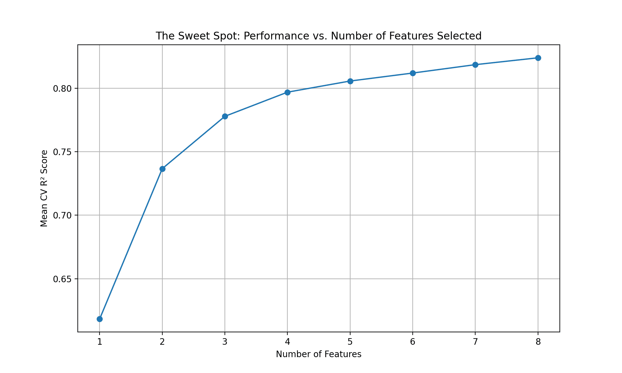 将此结果与根据其独立预测能力选择的前五个特征进行比较时,结果尤其具有启发性。在SFS选择中,“FullBath”(未被SFS选择)被“KitchenAbvGr”取代。这种差异凸显了特征选择的一个基本原则:**组合才是关键**。SFS不仅寻找强大的独立预测因子;它还寻找能够协同作用的最佳特征。这可能意味着选择一个自身并不排在前列的特征,但当与其他特征组合时,它能提高模型的准确性。